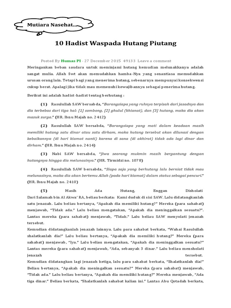 Hadits Tentang Hutang Yang Tidak Dibayar : Dapatkan penjelasan bukan hanya jawaban.. Yang mana dalam hal ini terdapat beberapa kumpulan hadits tentang saling berbagi berikut penjelasannya dengan secara singkat dan jelas. Daftar dalil, ayat dan hadits nabi muhammad saw mengenai hutang (kewajiban membayar kali ini akan dishare kumpulan hadist tentang hutang piutang lengkap dalam tulisan bahasa arab dan artinya. Penyesalan yang mendalam tiada berguna bagi orang yang meninggal dunia tanpa dibekali amal sholeh selama hidupnya di dunia. Ajukan pertanyaan tentang tugas sekolahmu. 8 hadits tentang hutang piutang.