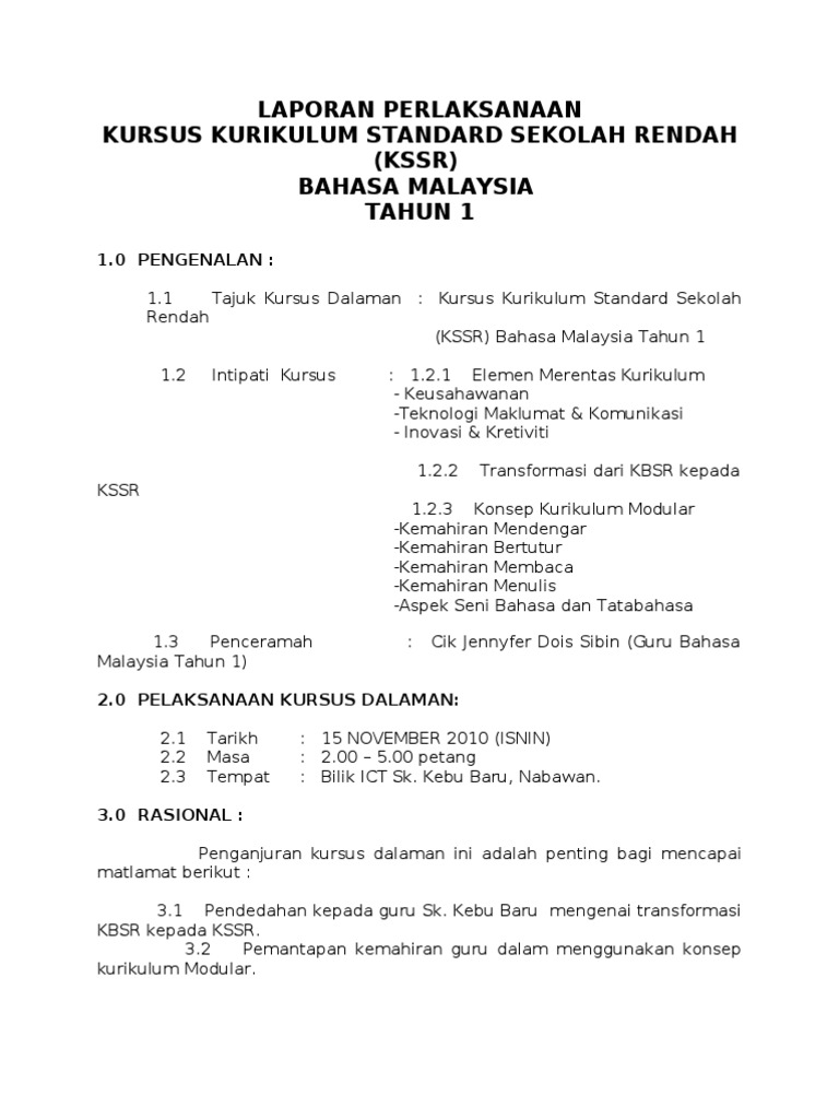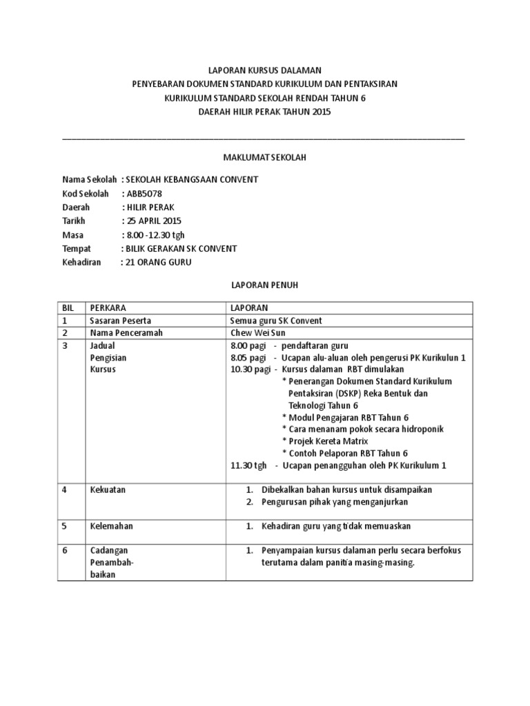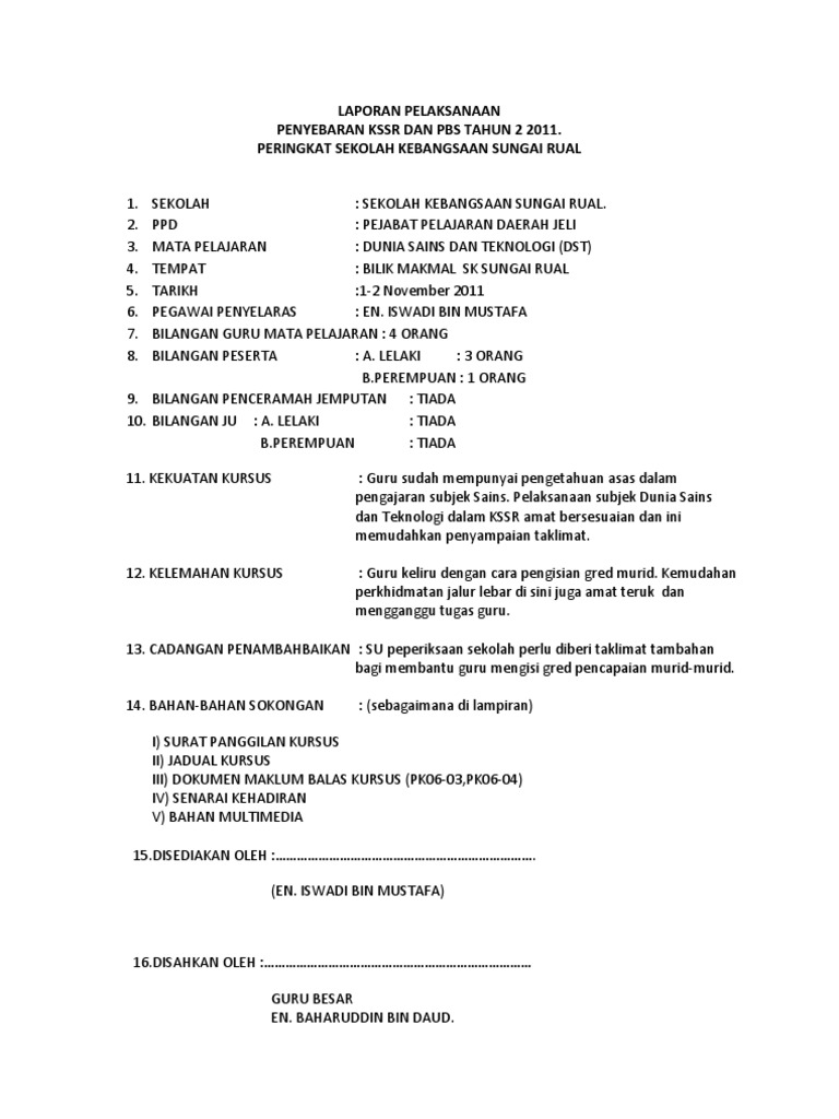 / x surat fasilitator : Kursus pendedahan kurikulum standard sekolah rendah (kssr) dokumen standard kurikulum dan pentaksiran (dskp) mata pelajaran sains tahun 4. 5 oktober 2013 ( sabtu ) tempat Laporan kursus penyebaran kssr/pbs borang pengesahan kehadiran kursus penyebaran pbs tahun 3 peringkat sekolah slot 1 bil. Contoh laporan kssr hasil dapatan kursus dihadiri. Laporan audit kendiri 01 o 03 04 permohonan rasmi kepada mampu. Inilah contoh laporan jawatankuasa audit dalaman. 1 20 petang 3 00 petang 1 3 tempat. Nama mohammad hafiz bin ishak (691003105939) salbiah binti musa (680224106886) suhaimi bin yusoff (710219035791) 2 jawatan penolong kanan pengarah kastam ii w48 3. 9 oktober 2012 1.2 masa : Khamidi selaku wakil ketua panitia sejarah yang menghadiri kursus di dewan sjkc hua min temoh. Sasaran guru tahap 2 yang mengajar sejarah.(guru yang mengajar tahun 4 hingga 6) 2. 1 dunia muzik tindakan/jurulatih utama sekolah pn.